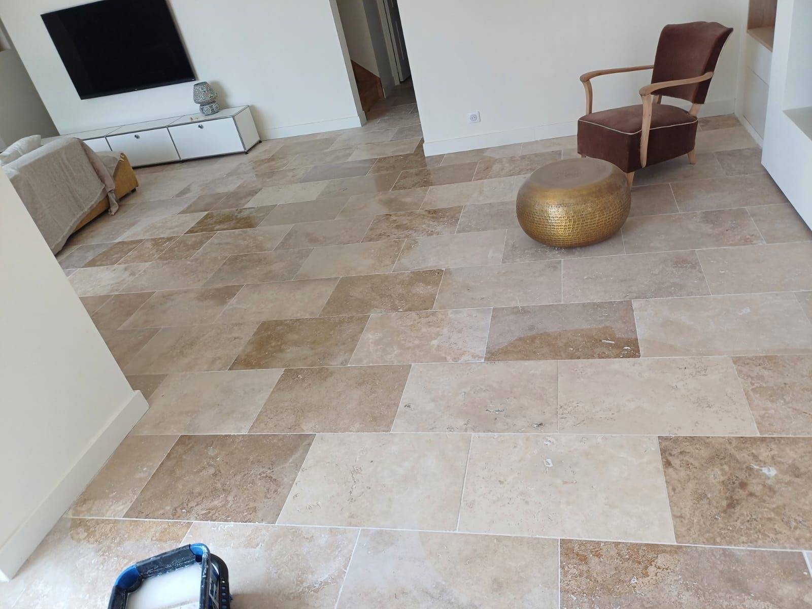 Avant l'application du revêtement, un ragréage intégral du sol a été réalisé afin de corriger les irrégularités, d’assurer une planéité parfaite et de garantir la durabilité du carrelage naturel. Cette étape est essentielle pour optimiser la pose de la pierre et éviter toute fissuration future.